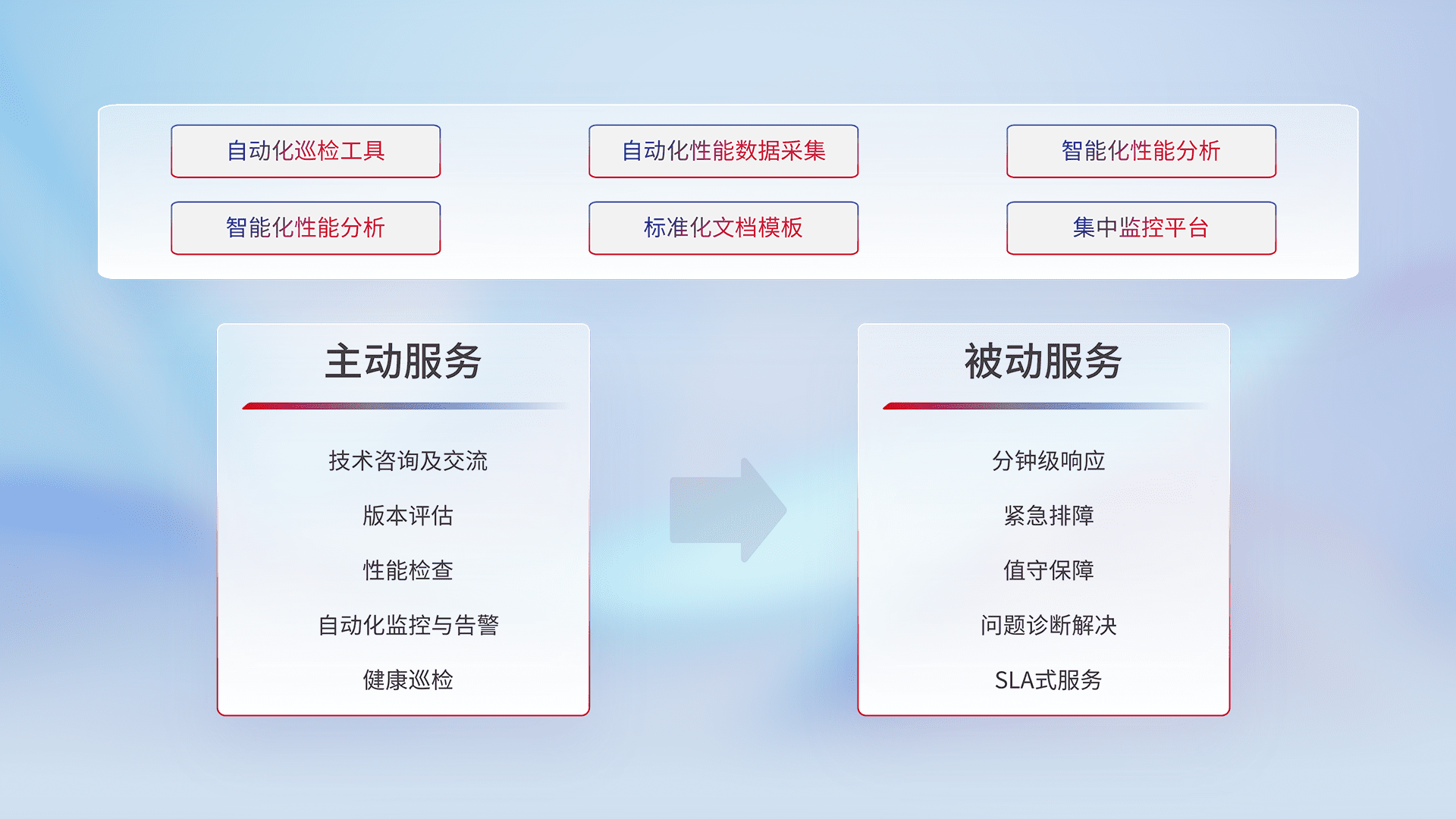 智能化工具和标准化文档,,,保障服务质量,,,,提供主动服务(包含技术咨询、、、版本评估、、性能检查、、、、自动化监控与告警、、、健康巡检)和被动服务包含(分钟级响应、、、、紧急排障、、、值守保障、、问题诊断解决、、SLA服务)。。。